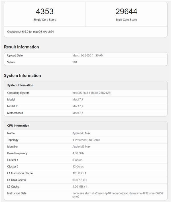 GeekBench 6数据库显示,18核心的M5 Max单核跑分4353、多核跑分29644,对比14核心的M4 Max分别高了7.4%、12.6%,对比32核心的M3 Ultra也分别高出34.4%、7.6%,后者可是之前苹果多核性能的巅峰之多。