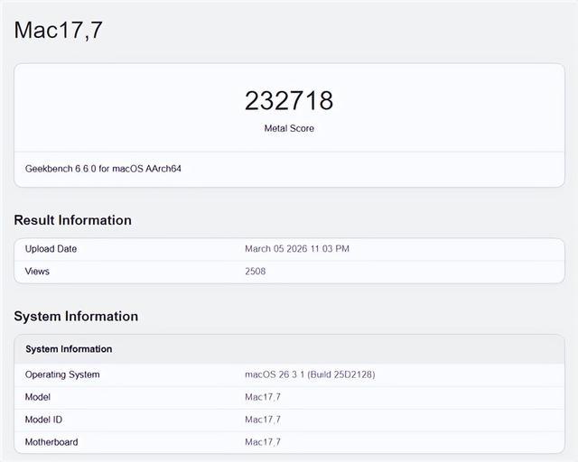 还有个坏消息,M5 Max CPU性能彪悍,GPU性能却表现平平,GeekBench 6 Metal下计算跑分只有232718,比上代提升13.8%。